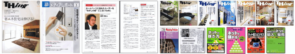 左からLIXIL会報誌THing(シィング)、YKKメディアレポート、創樹社ハウジングトリビューン、日本木材新聞、日本一やさしいネットの稼ぎ方、あなたの会社&お店がネットで儲かる、初めての最強ネット輸入ビジネス、初めてのネット輸入&販売、その他、新建ジャーナル・・住宅新報・日本住宅新聞など。中でもLIXIL(旧トステム)会報誌Thingは4回の連載予定が8回に延長された人気コラム。他多数。