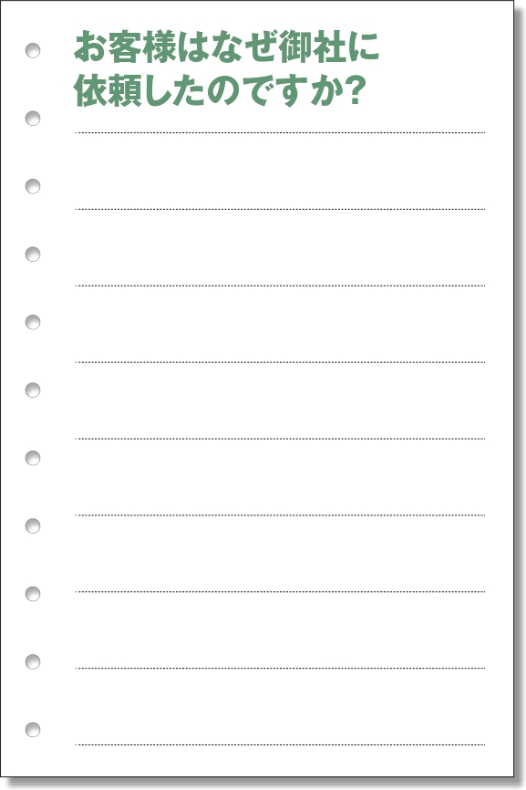 しかし、お客様からすれば、もっとも高価な買い物をするわけですから、理由なくあなたに依頼するはずはありません。あなたが気づいていないだけで、もっと違うところにあなたの会社の魅力をお客様は感じていたのではないでしょうか? なぜあなたに住まいづくりを託してくれたのか、ぜひこの機会に考えてみてください。メモに書き出してください。 頭の中で分かっていると思わないで書き出してください。あなたにとって濃いお客様を集めるために必要な作業です。